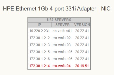 By clicking on the firmware category, I can fine-tune the results to give me every server that uses that hardware and what version they’re on. In this case, one server is highlighted in red to alert me that it is behind the latest version